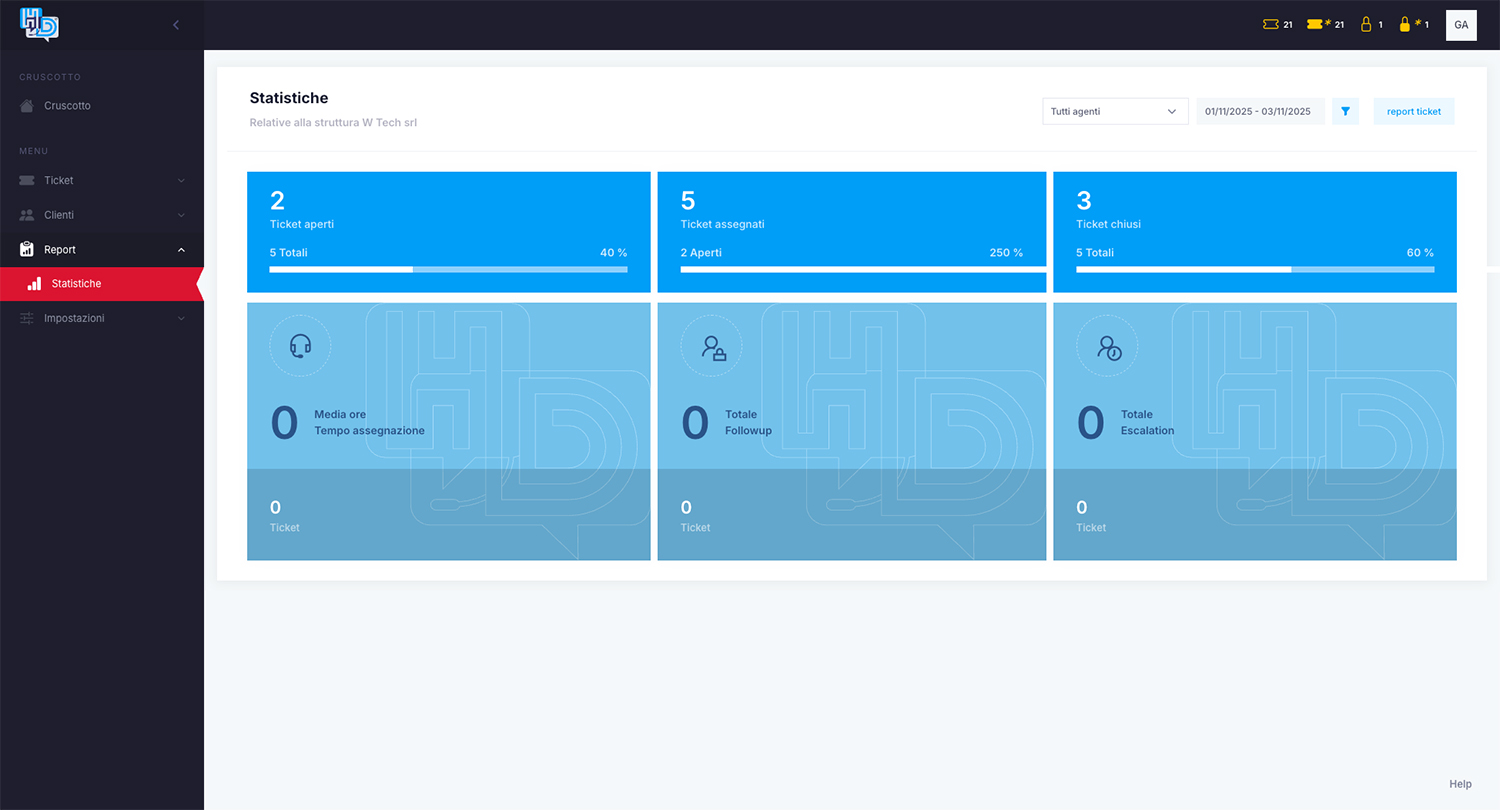 Analisi dei carichi di lavoro, tempi di risoluzione e performance degli operatori.
